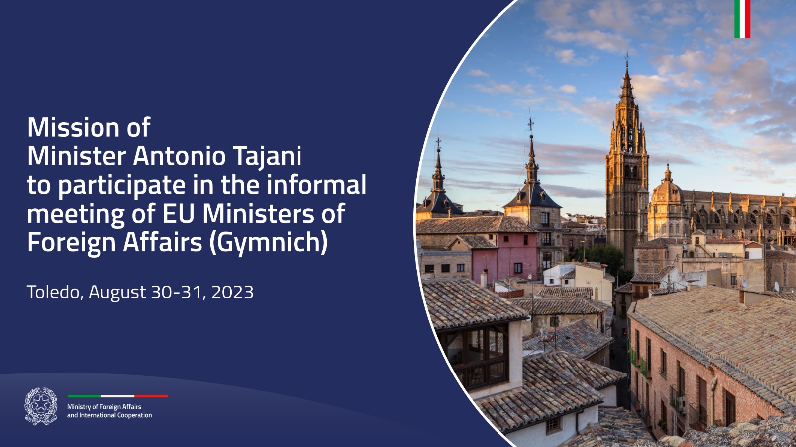 Deputy Prime Minister and Minister of Foreign Affairs and International Cooperation, Antonio Tajani, will be in Toledo today and tomorrow, 30-31 August, to attend the Informal Meeting of the Foreign Ministers of the European Union (Gymnich).