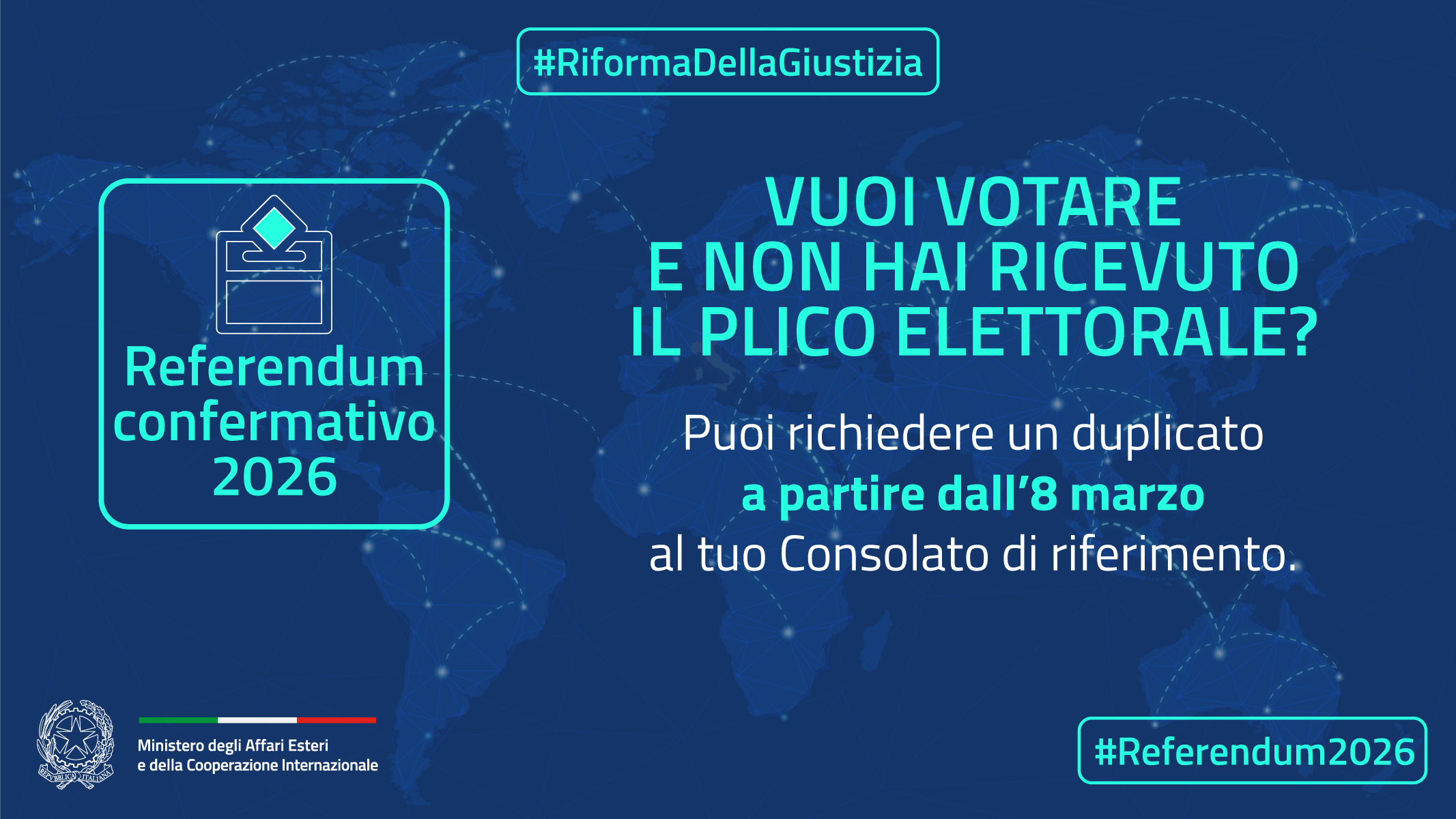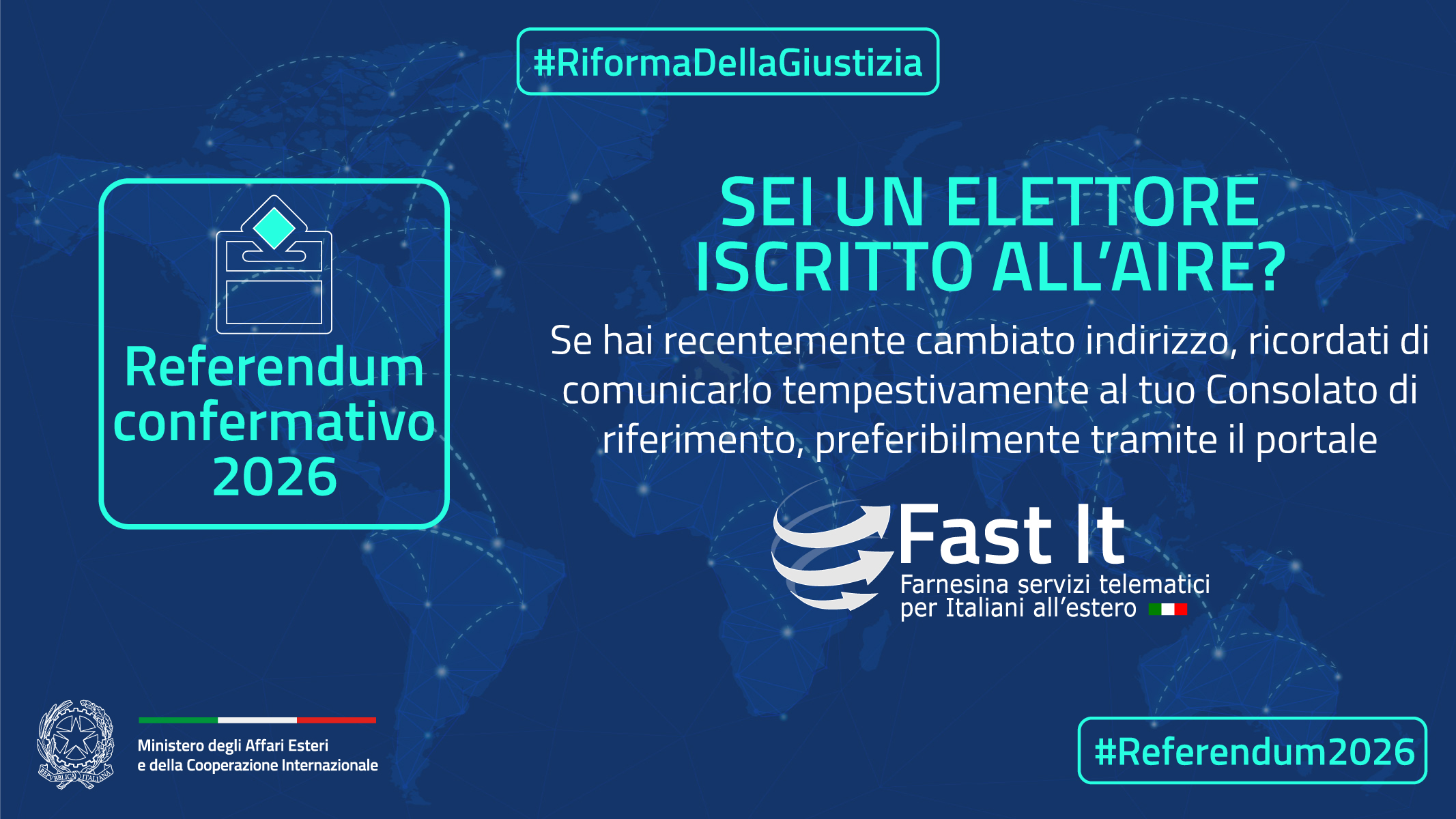 It is recalled that VOTING is a RIGHT protected by the Italian Constitution and that, pursuant to Law No. 459 of 27 December 2001, Italian citizens residing or temporarily staying abroad, registered on the electoral lists, may VOTE BY MAIL, receiving their electoral package at their residence address. To this end, it is recommended to check and, if necessary, immediately update one’s personal and address details with the competent Consular Office (under Italian law, electoral packages must be sent approximately one month before the vote in Italy), preferably using the online consular services portal Fast It.