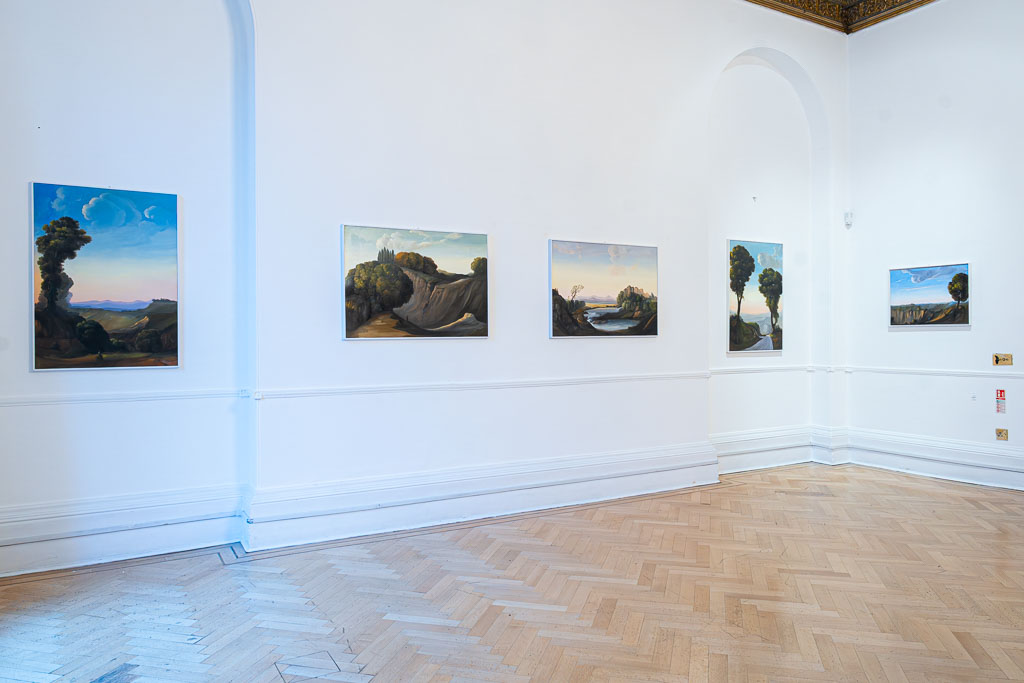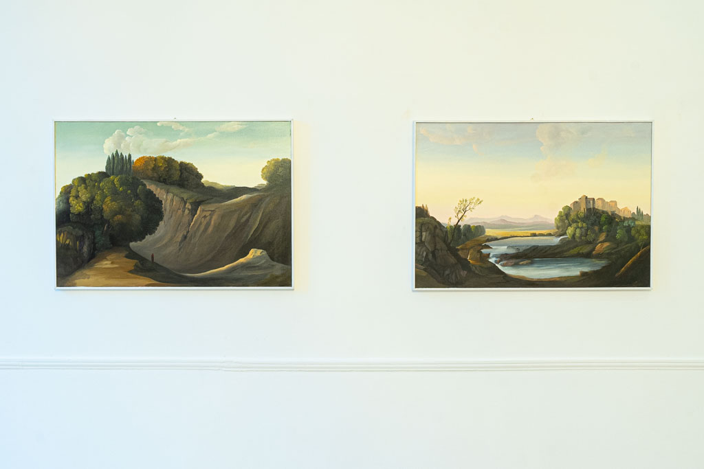 “The work,” Bartolini said at the vernissage, attended by curator Luca Tommasi, “does not follow a temporal path, but its narrative revolves around the same thematic point, almost as if it were a development without growth, a signifier without meaning”. The exhibition features both real and fantastical landscapes, evoking the Marche region as well as the English countryside.