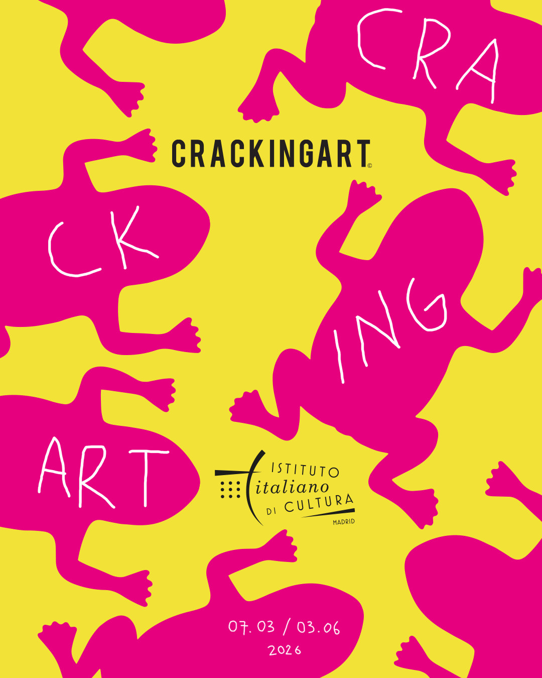 On the occasion of the 45th ARCOmadrid, the Italian Cultural Institute in Madrid inaugurates the 1st Italian Contemporary Art Week, turning the Abrantes Palace into a hub of international experimentation. The exhibition programme involves the entire structure, beginning with the exterior façade, which is “invaded” by the iconic colourful frogs of the Cracking Art movement, a metaphor for the lively current artistic debate. Inside, the courtyard hosts site-specific murals by Marco Tamburro dedicated to the theme of freedom, while the BLAU exhibition by Elia Festa explores the essentiality of forms through photographic and technological research linked to the fluid element.