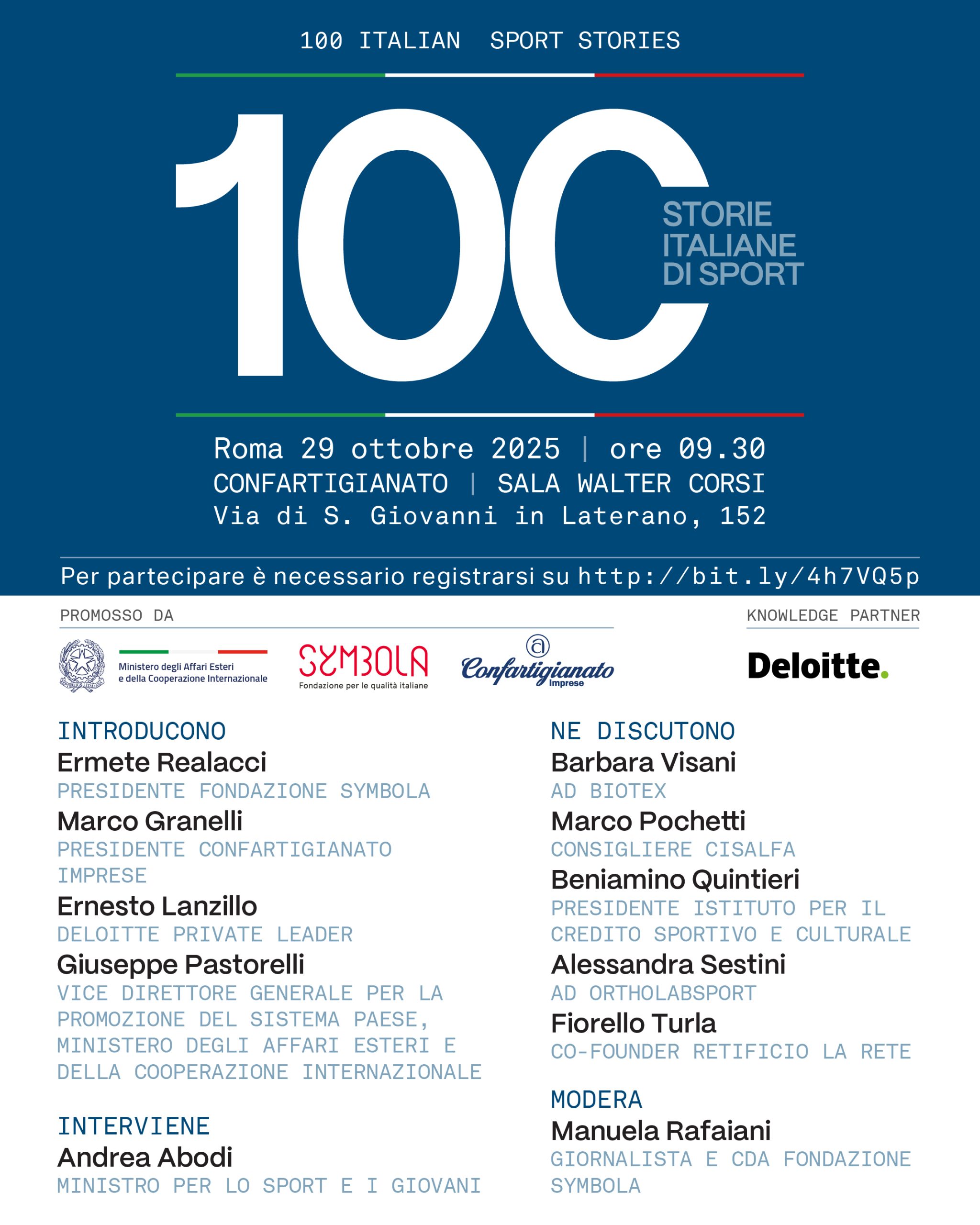 Il Ministero degli Affari Esteri e della Cooperazione Internazionale, la Fondazione Symbola, Confartigianato Imprese, con Deloitte come knowledge partner, hanno promosso l’evento “100 Italian Sport Stories”, uno spazio dedicato alle eccellenze italiane nel mondo dello sport e dell’innovazione. L’appuntamento si è tenuto mercoledì 29 ottobre 2025, presso la Sala Walter Corsi di Confartigianato, in Via di S. Giovanni in Laterano, a Roma.
