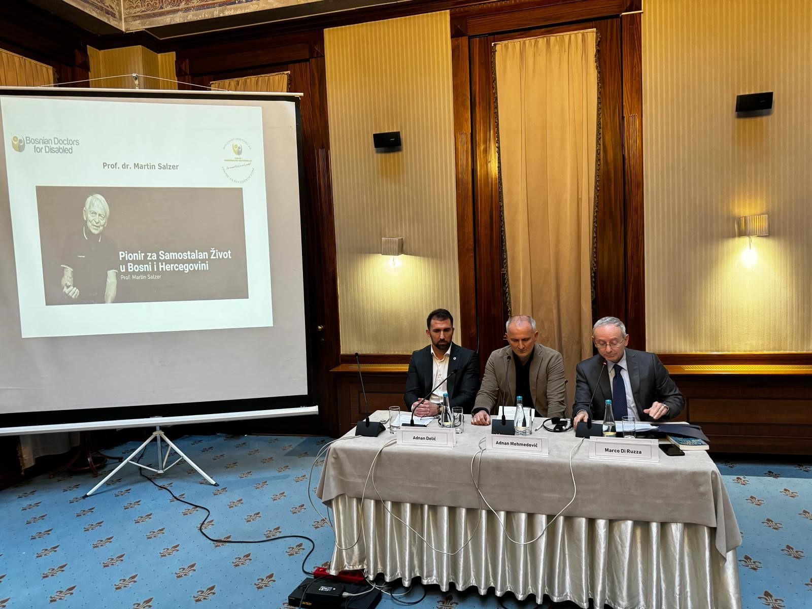 The event “La strada che non scegli” (The road you do not choose), dedicated to the theme of disability, was held at the Europa Hotel in Sarajevo. It was promoted by the Italian Embassy in Bosnia and Herzegovina in collaboration with the association “Bosnian Doctors for Disabled” (BDfD) and the local Dante Alighieri Society. The event was attended by authoritative institutional representatives of Bosnia and Herzegovina, including the Federal Minister of Labour and Social Policy, Adnan Delić; the Assistant Minister of the State Ministry for Human Rights and Refugees, Kemo Sarač; the Minister of Justice of the Canton of Sarajevo, Darja Softić-Kadenić; and several senior officials of the State Ministry of Civil Affairs, as well as members of Parliament.