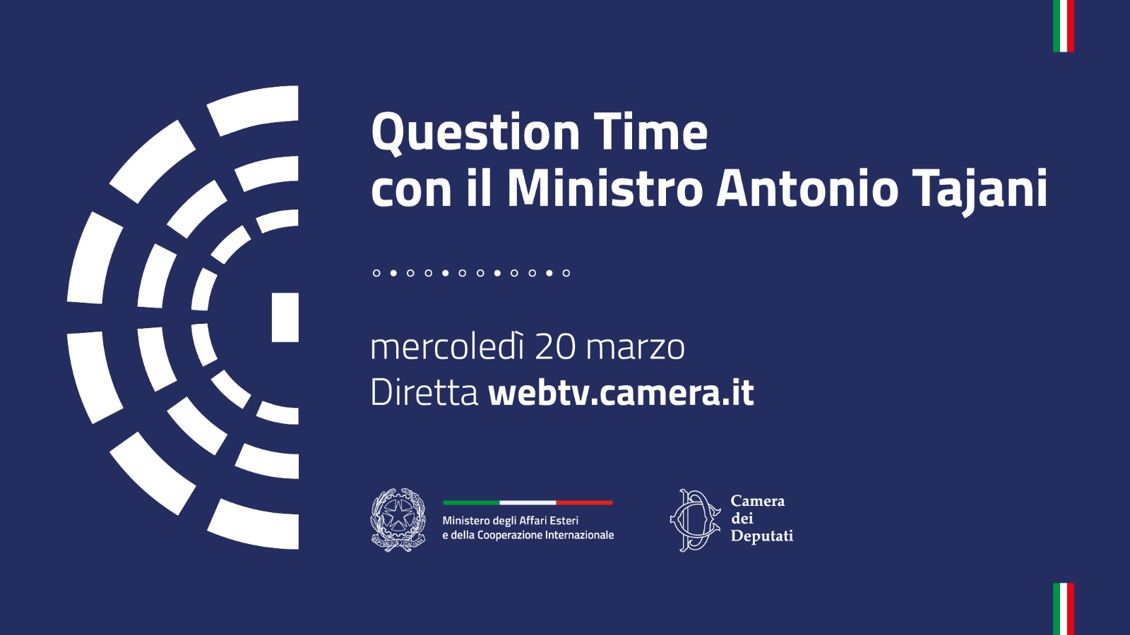 Il Vice Presidente del Consiglio e Ministro degli Affari Esteri e della Cooperazione Internazionale, Antonio Tajani, partecipa oggi alla sessione di Question Time alla Camera dei Deputati.