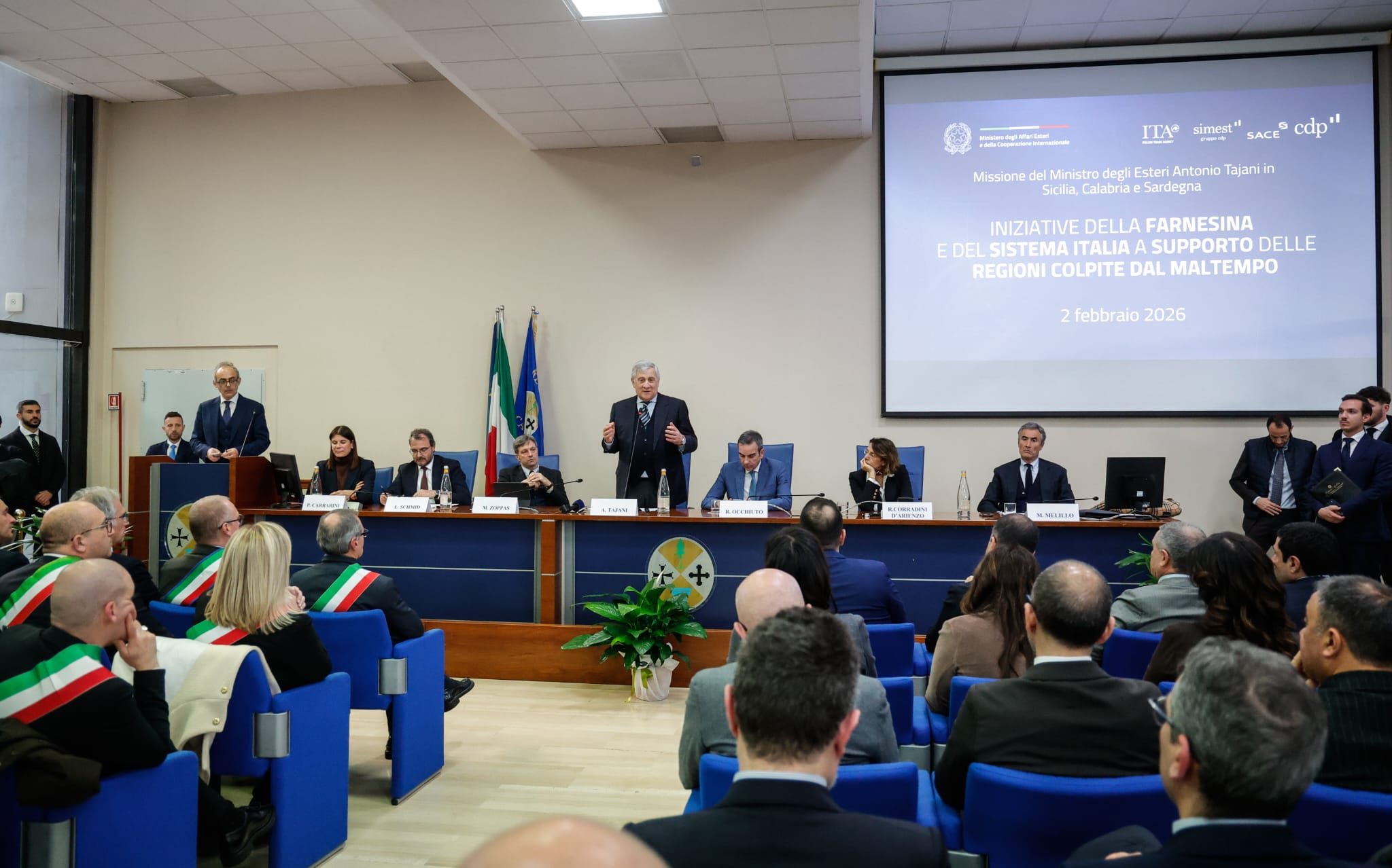 Il Ministro degli Esteri Antonio Tajani ha guidato una missione di sistema a sostegno del tessuto produttivo di Sicilia, Calabria e Sardegna, regioni duramente colpite dalle calamità naturali dello scorso gennaio. La visita si è inserita nel quadro delle iniziative del Governo a favore dell’internazionalizzazione e ha visto la partecipazione dei vertici di ICE, SIMEST, SACE e Cassa Depositi e Prestiti.