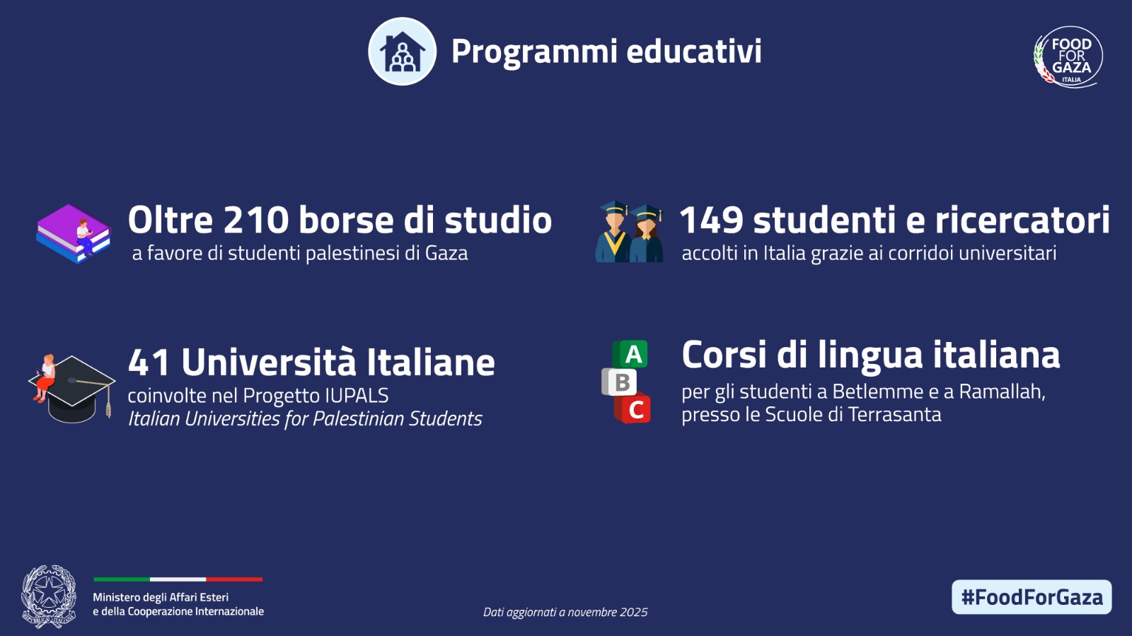 Oltre 210 borse di studio sono state assegnate a studenti palestinesi di Gaza, tra i bandi ordinari del sistema delle Università italiane e il progetto “Italian Universities for Palestinian Students” (IUPALS), che coinvolge 41 università italiane. A queste si aggiungono oltre 50 borse assegnate a studenti palestinesi residenti in Cisgiordania.