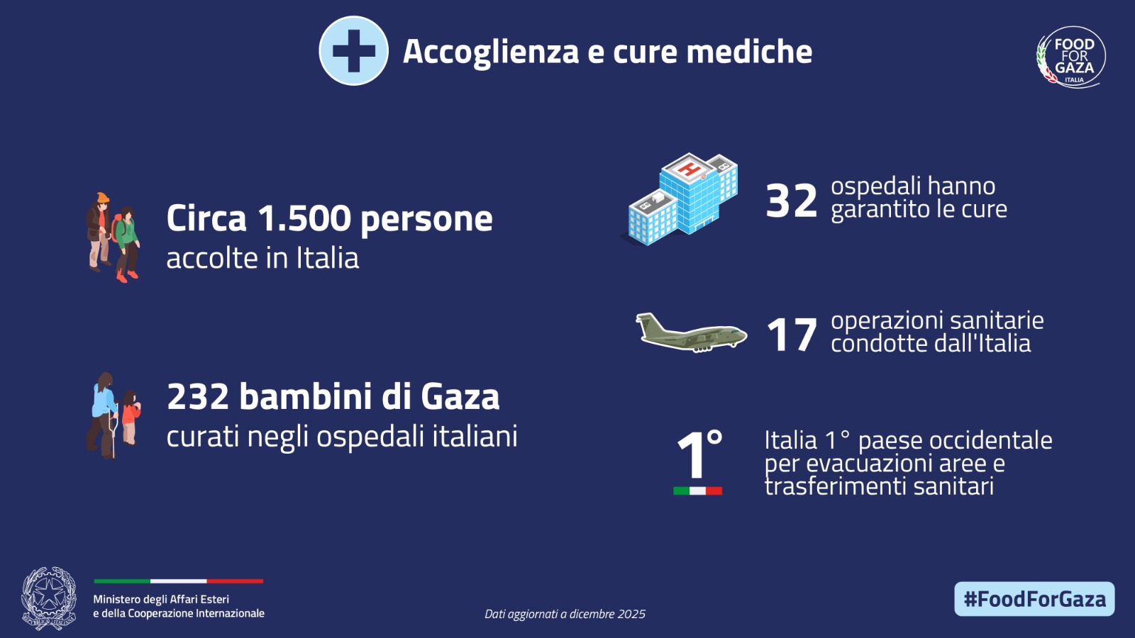 L’Italia ha assicurato priorità all’accoglienza di bambini palestinesi malati. Le operazioni sanitarie hanno finora permesso di ricoverare presso strutture sanitare in Italia 232 bambini di Gaza, accolti con i loro familiari, per un totale di 849 persone.