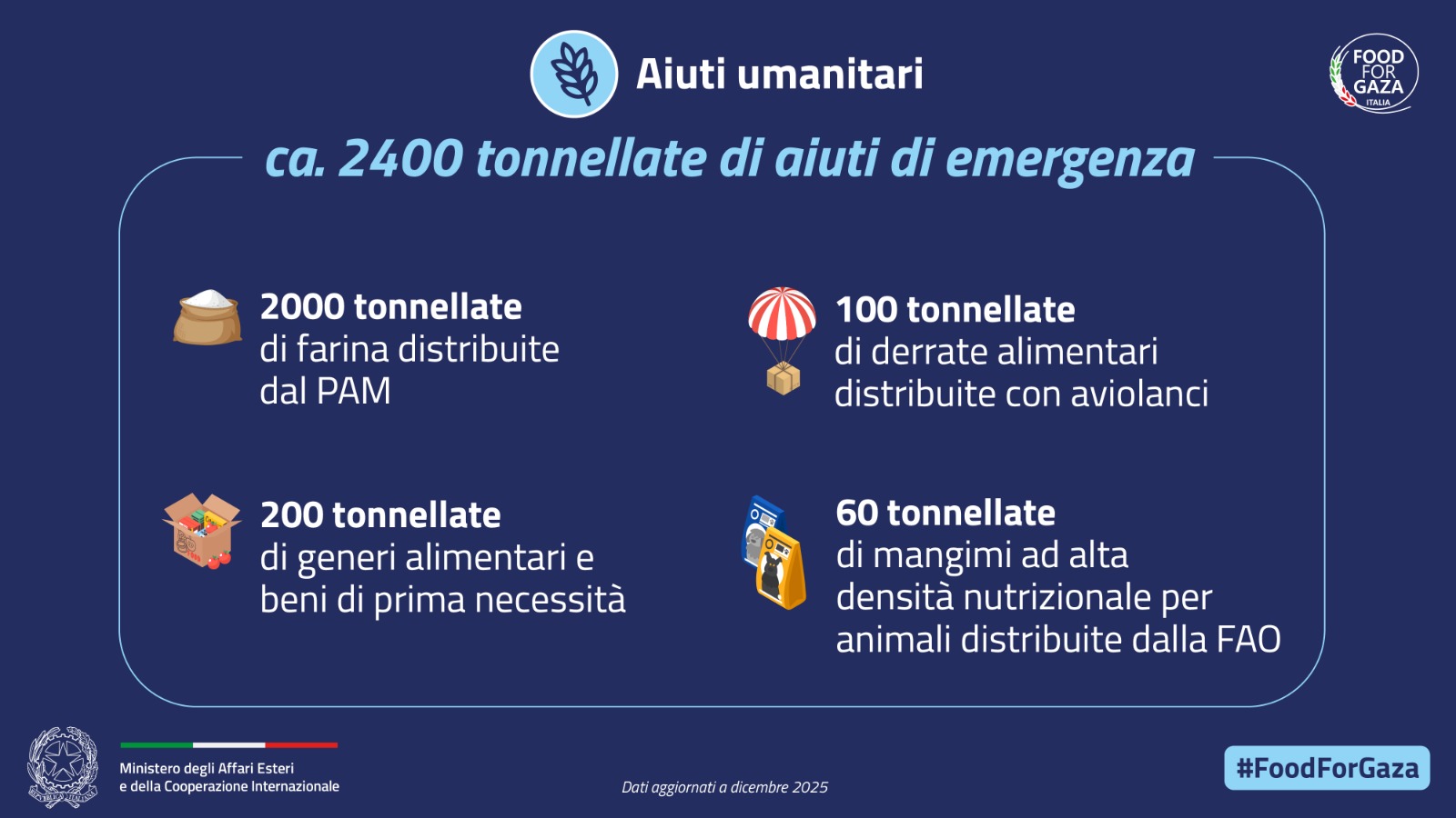 Grazie a Food for Gaza l’Italia ha destinato alla Striscia di Gaza circa 2.400 tonnellate di aiuti alimentari, sanitari e beni di prima necessità. Gli aiuti sono transitati attraverso il Programma Alimentare Mondiale e la Croce Rossa Internazionale, istituzioni autorevoli e imparziali, che godono della fiducia di entrambe le parti.