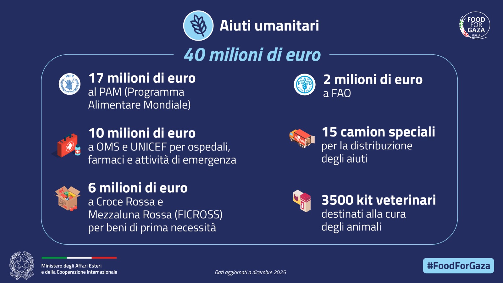 Negli scorsi mesi, il Consiglio dei Ministri ha prorogato lo stato di emergenza per interventi nella Striscia di Gaza, innalzando a circa 40 milioni di euro i contributi finanziari dedicati al solo progetto Food for Gaza, anche per effetto del nuovo stanziamento, pari a 10 milioni di euro, devoluto a OMS e UNICEF, per sostenere gli ospedali, procurare medicine e supportare le attività di emergenza in campo medico-sanitario nella Striscia.