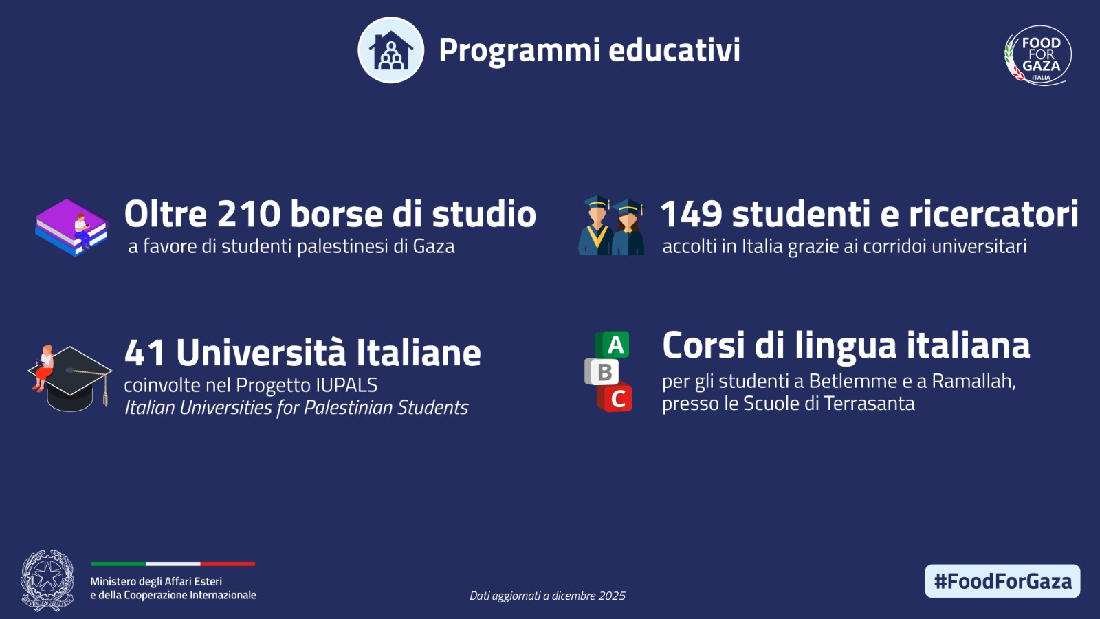 Oltre 210 borse di studio sono state assegnate a studenti palestinesi di Gaza, tra i bandi ordinari del sistema delle Università italiane e il progetto “Italian Universities for Palestinian Students” (IUPALS), che coinvolge 41 università italiane. A queste si aggiungono oltre 50 borse assegnate a studenti palestinesi residenti in Cisgiordania.