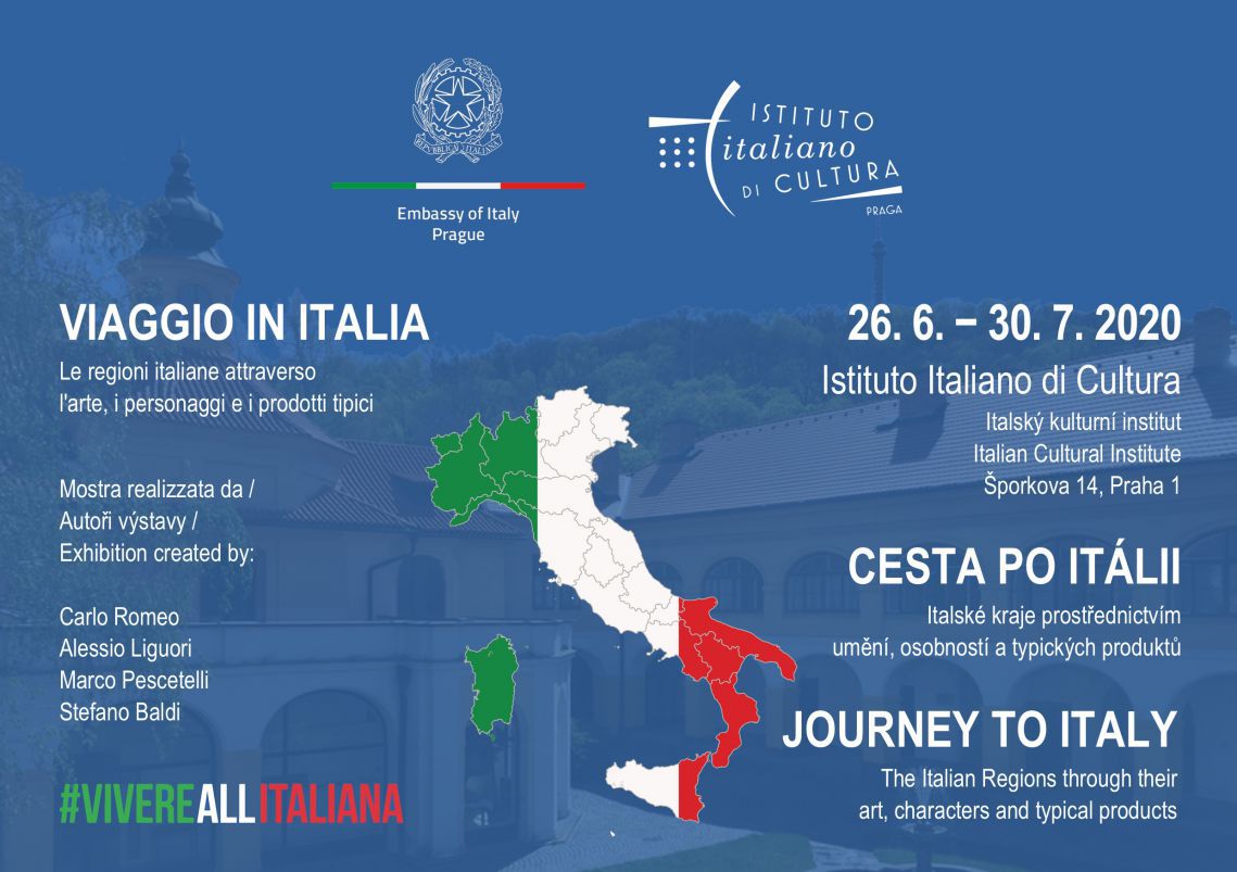 Dal 26 giugno al 30 luglio il chiostro dell’Istituto Italiano di Cultura di Praga ospiterà la mostra “Viaggio in Italia”, concepita da Carlo Romeo, Alessio Liguori, Marco Pescetelli e Stefano Baldi come un percorso attraverso tutte le regioni italiane per mezzo di pannelli fotografici. Ciascun pannello presenta uno scatto a carattere paesaggistico, l’icona di un personaggio rappresentativo della regione, un prodotto enogastronomico e uno artigianale/industriale tipici del territorio.