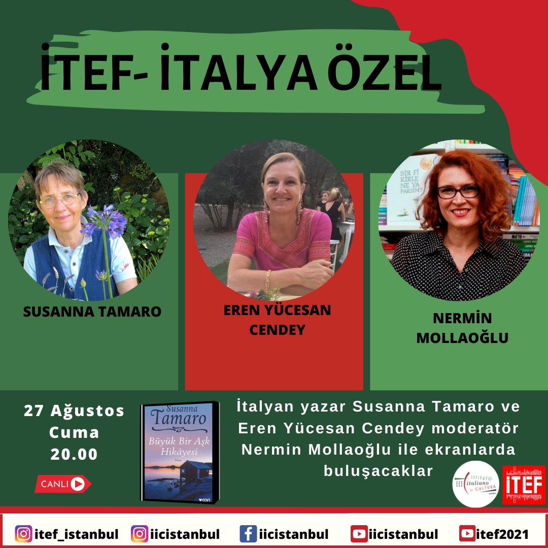 “İTEF – Festival Internazionale della Letteratura di Istanbul – Speciale Italia” sarà online sui canali sociali di ITEF e dell’Istituto Italiano di Cultura di Istanbul dal 23 al 27 agosto 2021. L’anno scorso, nell’ambito di “İTEF – Speciale Italia”, sono intervenuti, parlando di letteratura, Ferzan Özpetek, Mario Mazzanti, Fioly Bocca, Ilaria Tuti, Alessia Gazzola e l’agente letterario Fiammetta Biancatelli, uno dei fondatori dell’agenzia letteraria Walkabout.