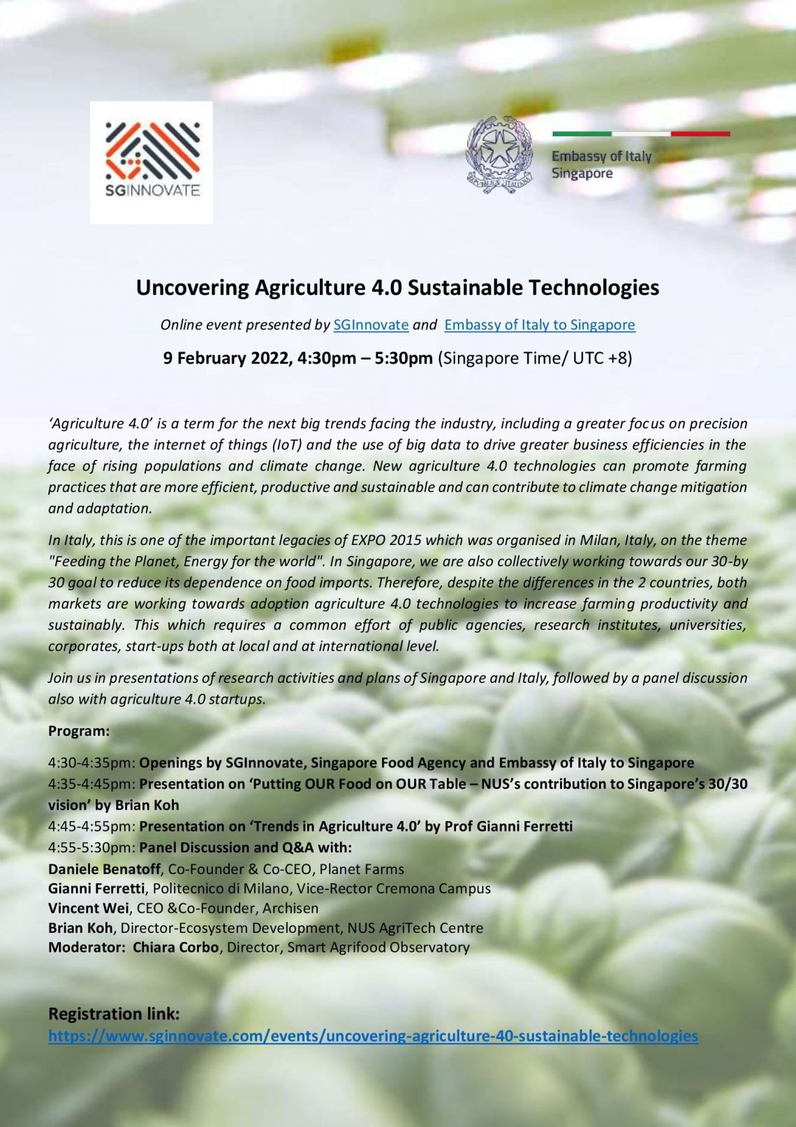 L’Ambasciata d’Italia a Singapore ha organizzato, insieme all’Agenzia SGInnovate, un webinar sulle nuove tecnologie nell’agricoltura sostenibile. All’evento, “Uncovering Agriculture 4.0 – Sustainable Technologies”, che si è svolto nei giorni scorsi, hanno partecipato Gianni Ferretti, docente del Politecnico di Milano, Chiara Corbo, Direttrice dell’Osservatorio Smart Agrifood, Daniele Benatoff, cofondatore di Planet Farms; tra i partecipanti anche dirigenti della Singapore Food Autority e del NUS Agritech Center. Nel corso della discussione, sono emersi molti elementi di ricerca e sviluppo in comune fra Italia e Singapore e possibili future sinergie. In particolare molto interesse ha suscitato l’esperienza e la tecnologia di Planet Farms in Italia.