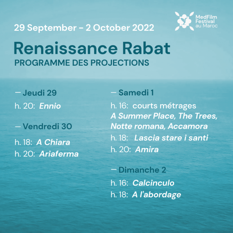 Il progetto, realizzato con la collaborazione dell’Istituto Italiano di Cultura a Rabat, l’Associazione Methexis Onlus, la Fondazione HIBA, la Scuola Superiore di Arti Visive di Marrakech (ESAV) e il Cinema Renaissance di Rabat, propone una selezione di undici film tra titoli italiani, francesi, egiziani e libanesi con una caratteristica in comune: qui il “mare di mezzo”, il Mediterraneo, gioca un ruolo d’incontro e scambio, non solo tra persone, ma anche d’idee e culture.